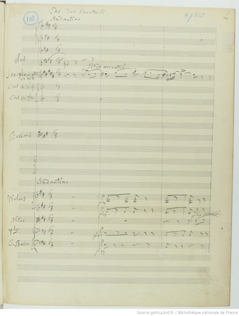 Recently I went through the Metropolitan Opera’s archives to see if they have any works for saxophone in their performance history that I have yet to find. During this search, I discovered Ambroise Thomas‘s Hamlet was performed for their inaugural season in 1883-84. Did they use the saxophone in the finale of the 2nd act and the 4th act ballet as Thomas intended? Well I started researching and I have yet to find any definitive information, but during this research, I found another work by Thomas based on Shakespeare, La tempête written in 1889. On a whim, I went to see if I could find a full score to see if the ballet is orchestrated with a saxophone and sure enough, La tempête features the alto saxophone.