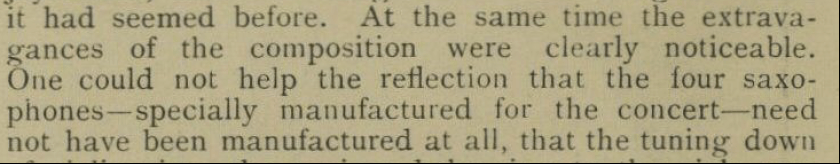 Joseph Holbrooke studied composition at the Royal Academy of Music in the late 1800s. He found early success after setting Edgar Allan Poe’s “The Raven” to music in 1900. Holbrooke set out to write his first symphony in 1905, Symphony no. 1 ‘Les hommages,’ Op. 40 which included S/A/T/B saxophones. Looking at the musical landscape in London at this time, it’s not unusual for Holbrooke to include saxophones because in that same year, Richard Strauss conducted his tone poem, Symphonia Domestica at the Queen Hall in London. This tone poem is notable for being the only piece Strauss wrote using saxophones and even more unusual, he wrote for saxophones tuned in C and F. The review of the concert was less than kind to Strauss and his expansive orchestration. The reviewer seems to indicate that saxophones tuned to C and F were manufactured specifically for this piece.[1]