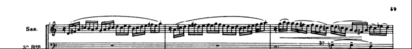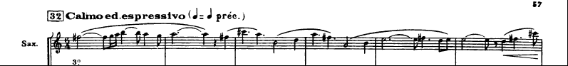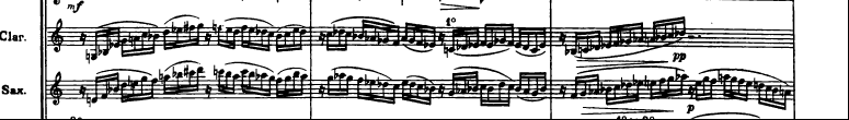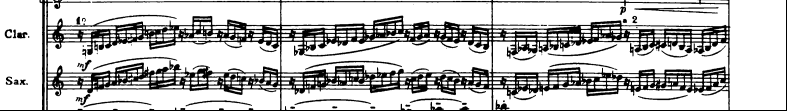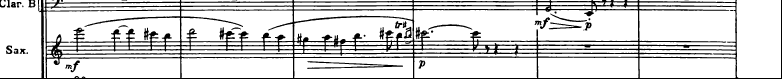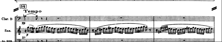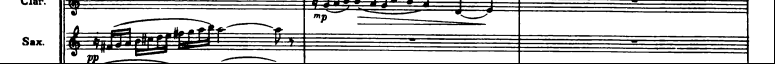 First off, the solo in “L’Age d’or” is a six beat pattern versus an eight beat pattern in Concertino. The melodic line is inverted in Concertino where most of the phrases start with a downward motion. The biggest difference between the two is the tempo. The saxophone in “L’Age d’or” floats above the orchestra while the saxophone in Concertino da Camera is a relentless whirl of sound underneath the orchestra. But where what they have in common is more important. Both solos are a background figure to the orchestra despite being a solo instrument. Both solos have the saxophone play a lyrical melody before becoming an accompaniment to orchestra while the orchestra plays the melody the saxophone introduced. Both solos starts on the second 16th note of the measure, creating rhythmic tension and unresolved motion. Upon listening to “L’Age d’or” its easy to see how Ibert took this idea and developed it in Concertino da Camera.