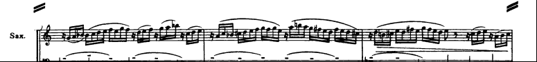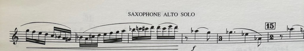 The alto saxophone solo starts out as a lyrical melody, before accompanying the rest of the orchestra in a 16th note pattern, starting at 3:23 in the above video.